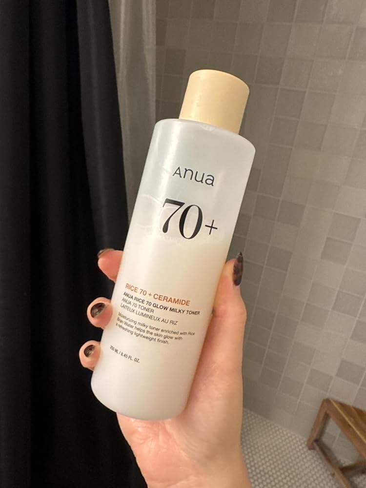 anua rice 70 glow milky toner features a lightweight milky texture and contains 70% rice extract to soften the skin and boost natural radiance.